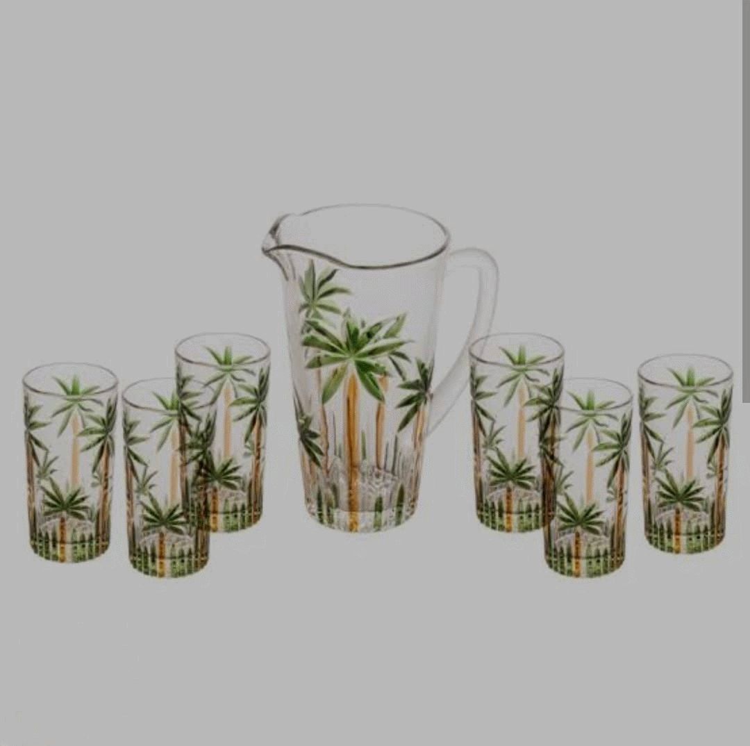 O Conjunto Palm Tree Handpaint traz charme e exclusividade à sua mesa. Composto por 7 peças — 1 jarra de 1,2L e 6 copos de 330ml —, é todo produzido em vidro e pintado à mão, com delicados detalhes de palmeiras tropicais. Ideal para servir sucos, águas ou drinks com elegância e um toque de frescor. Sofisticação e estilo para qualquer ocasião.