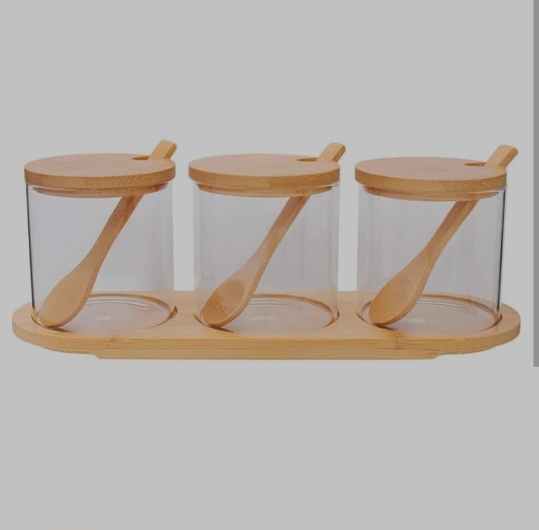 O design moderno com base e tampas em bambu traz um toque natural e sofisticado à cozinha, enquanto o material transparente permite visualizar facilmente o conteúdo. Cada pote possui colher individual e tampa com encaixe para o utensílio, garantindo higiene e praticidade no uso diário.