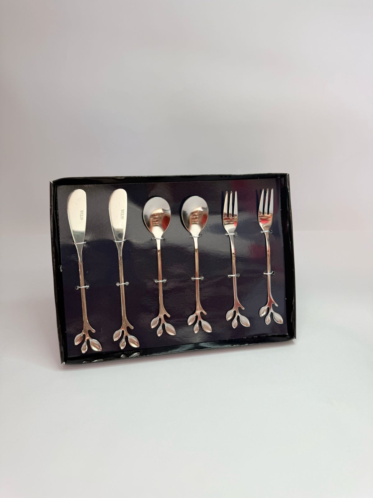 Conjunto refinado de talheres em aço inoxidável, com design exclusivo em formato de galhos nas extremidades, trazendo charme e sofisticação à mesa. Ideal para servir sobremesas, frutas e aperitivos com elegância.