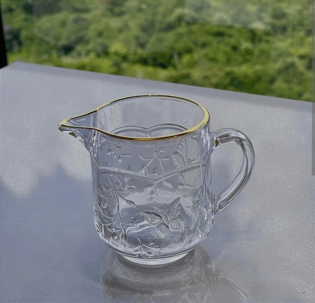 A Jarra New Butterfly Lyor traz elegância e delicadeza em vidro de alta qualidade, com relevo de borboletas e flores. O acabamento em fio de ouro adiciona um toque refinado à mesa. Ideal para servir sucos, leite ou molhos com estilo. Capacidade de 200ml. Sofisticação para o dia a dia ou ocasiões especiais. Imagem ilustrativa. ???